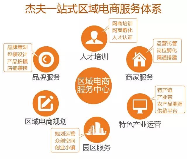答:杰夫电商提供品牌资质、服务体系、市场支持,负责服务执行落地。业务包括杰夫电商的"1个中心+3大平台+6大基础服务":